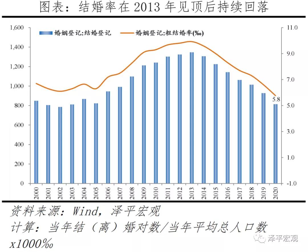 一是结婚对数和结婚率自2013年开始下滑。2013-2020年,我国结婚登记对数从1347万对的历史高点持续下滑至814.3万对,2020年同比下降12.2%;粗结婚率从9.9‰降至5.8‰。其中,《2019年民政事业发展统计公报》数据显示,2019年初结婚人数从2386万降至1398.7万人,再婚人数从307.9万升至455.9万人、复婚对数从29.9万对攀升至61.9万对。
