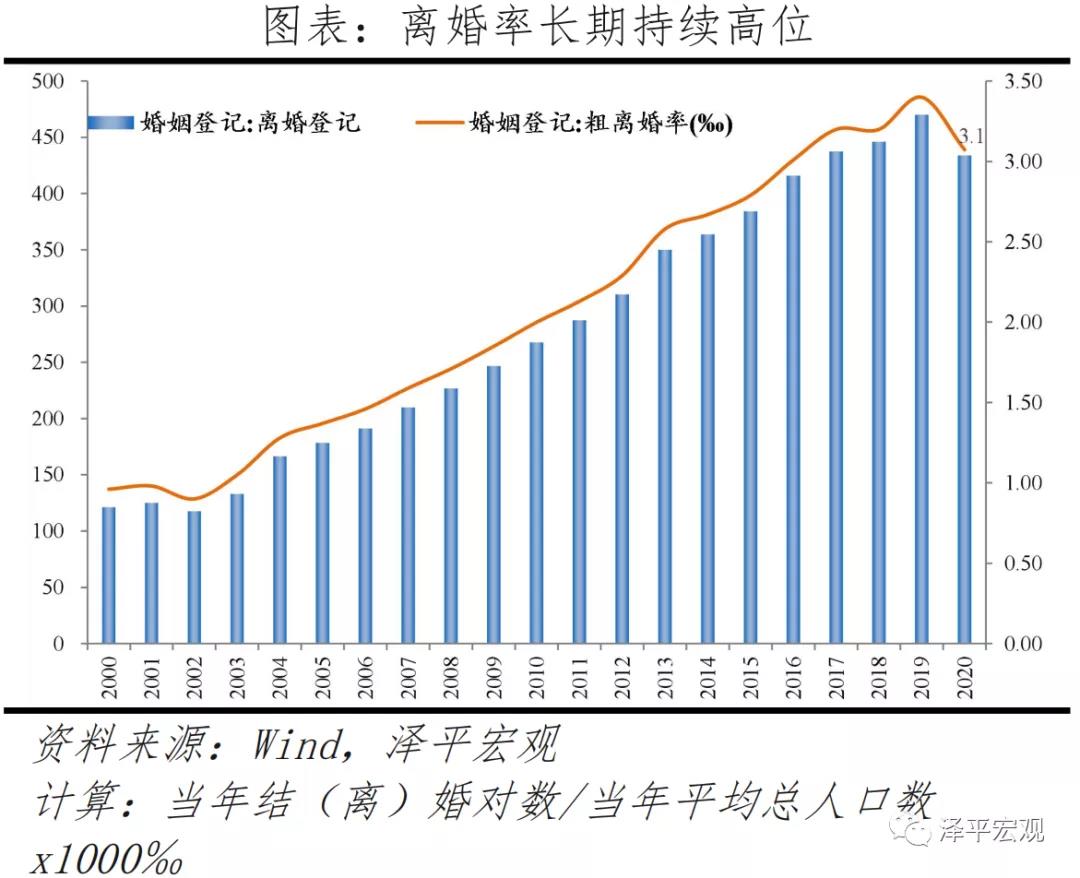三是离婚对数和离婚率长期持续攀升。1987-2020年,我国离婚登记对数从58万对升至373万对,依法办理离婚手续433.9万对,同比-7.7%;粗离婚率从0.5‰攀升至3.1‰,较上年下滑0.3个千分点。