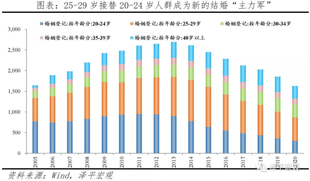 出生率下滑长期影响适婚年龄人数,进而导致结婚对数下滑。根据第七次中国人口普查资料,80后、90后、00后人口分别为2.19亿、1.88亿、1.47亿,90后比80后少约3100万,00后比90后少4100万。当前结婚年龄主力25-29岁(90后)人口大幅下滑,对结婚对数产生负面影响。