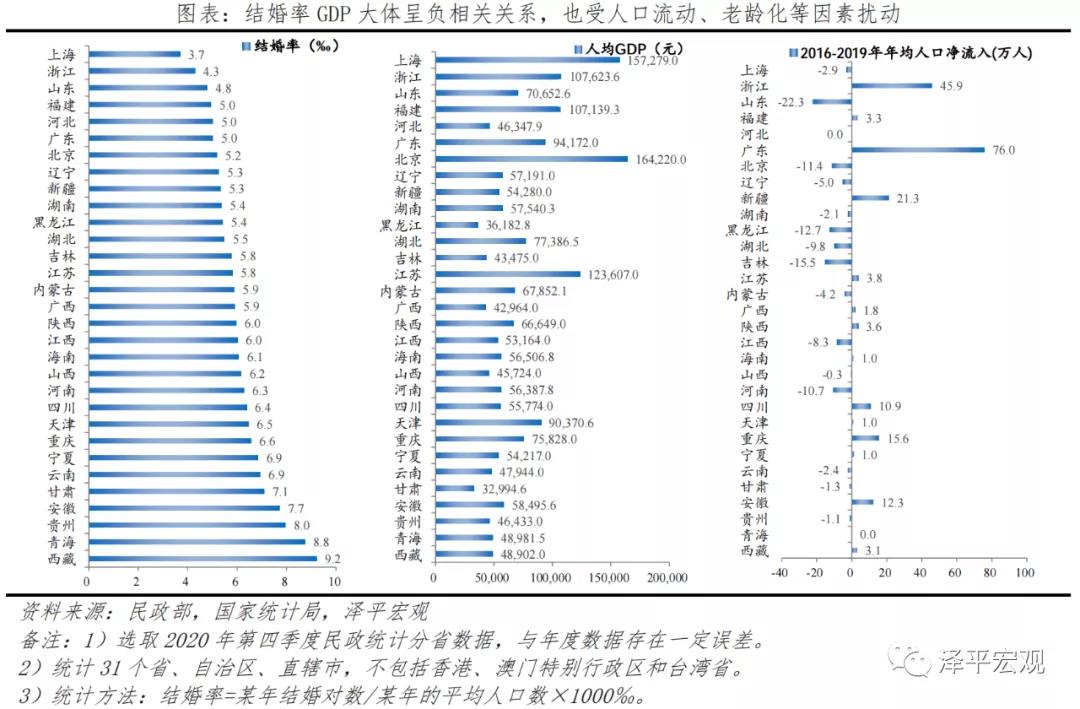 2013年以来,中国多数地区结婚率出现下滑。但地区之间存在差异,与GDP大体呈负相关关系,也受人口流动、老龄化等因素扰动。具体来看,