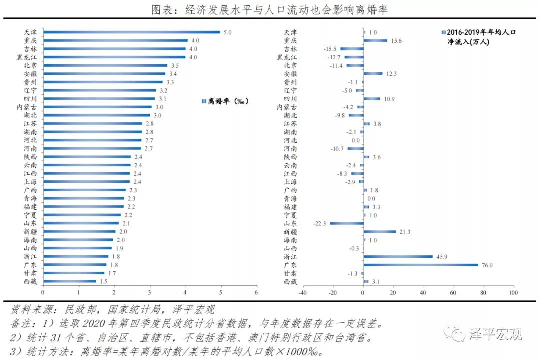 四是经济发展水平与人口流动也会影响离婚率,往往经济发展较弱、人口流出严重的地区,离婚率相对较高。夫妻长期两地分居动摇感情基础,是导致离婚的重要原因。黑龙江、吉林、辽宁离婚率分别为4.0‰、4.0‰、3.2‰。