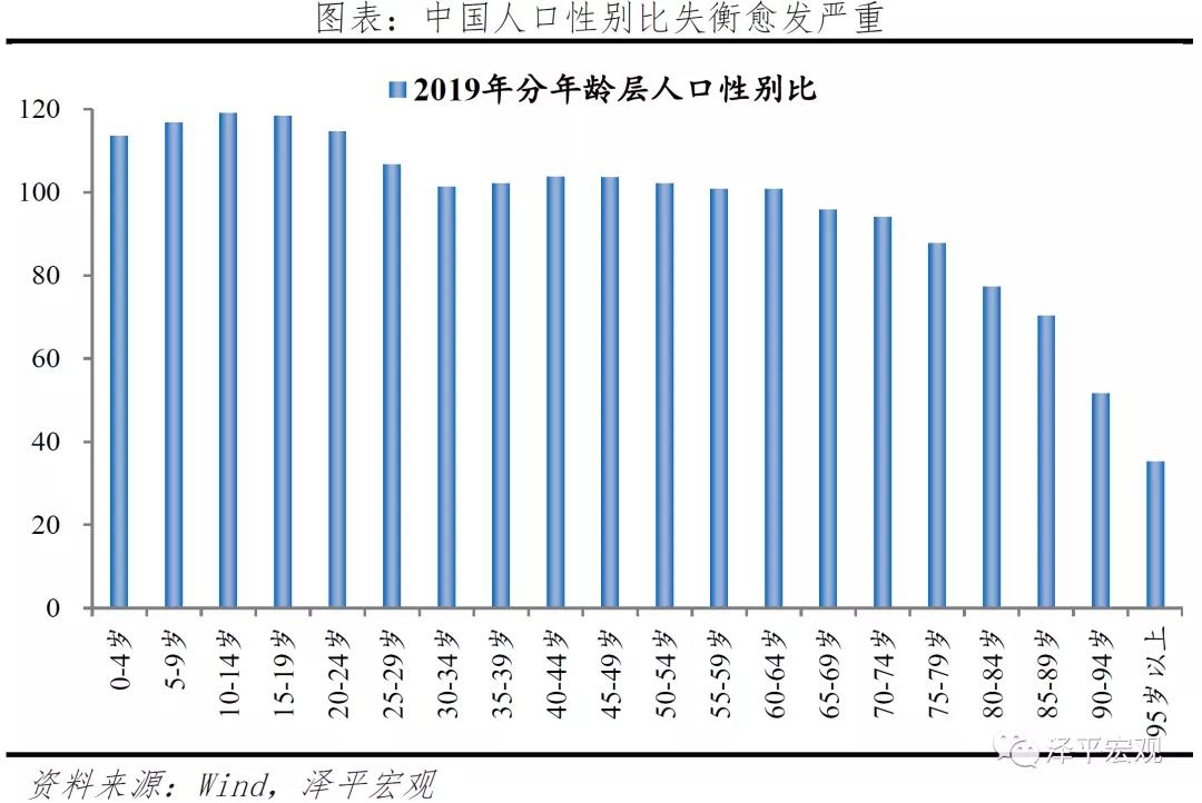 男女比例自计划生育后严重失衡,造成婚姻市场匹配困难,进而影响结婚对数。1982年出生人口性别比(男性:女性,女性=100)为107.6,1990年超过110,2000年接近118,之后长期超过120。根据2010年人口普查资料,00后男女性别比达119,男性比女性多近1300万;90后男女性别比达110,男性比女性多近900万。2020年人口普查数据显示,出生人口性别比已达111.3。