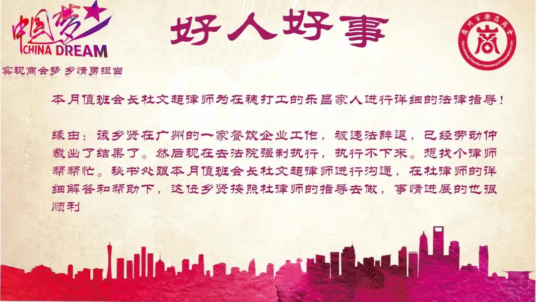10月值班会长杜文超律师为在穗打工的乐昌家人进行详细的法律指导。广州市乐昌商会的大门永远为广大在穗的乐昌家人们打开,家永远都是家人栖身的地方,是加油站、是港湾也是家人最留恋的地方,是让我们魂牵梦萦的地方。是一个让家人体会到爱与信任的地方。
